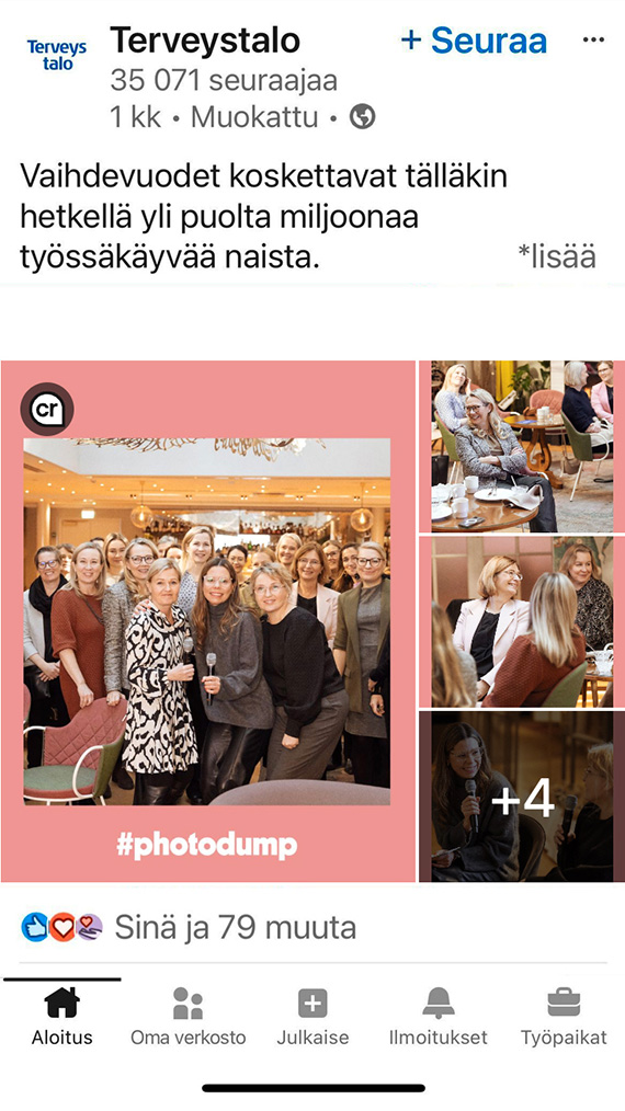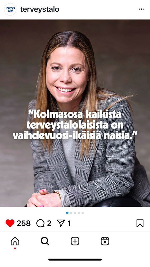 Terveystalon asiantuntijoiden ja johdon näkemykset näkyivät kaikessa sisällössä, ja näistä poimitut sitaatit toimivat näkyvinä nostoina sosiaalisessa mediassa. Sisällöissä tuotiin esiin myös Terveystalon tekemää työtä vaihdevuosiosaamisen ja -ymmärryksen lisäämiseksi yrityksen sisällä.