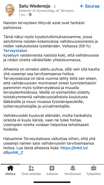 Terveystalo oli myös tunnistanut gynekologian alan kasvupotentiaalin. Tarjoamalla oikeanlaista tietoa ja hoitoa voitiin myös tukea liiketoimintaa.